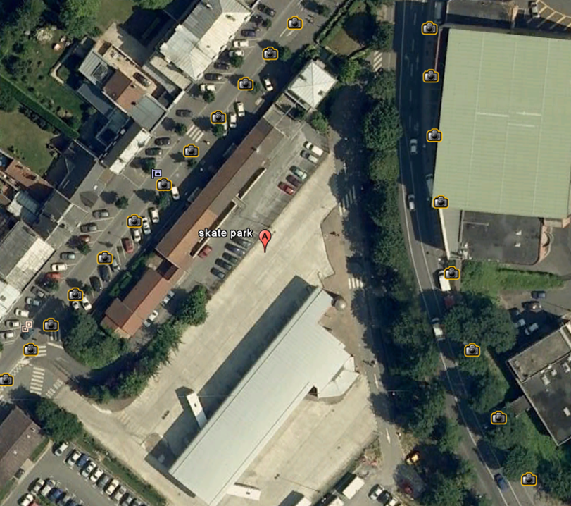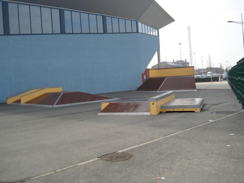 Dans ce skatepark il y 5 modules dont une pyramide avec 2 barres de slide un rampe de lancement avec 2 plan incliné, un ledge, un curbe, un plan incliné courbe+quarter-pipe (hauteur: 2m) un grand plan incliné avec 2 quarter-pipe aux extrémités